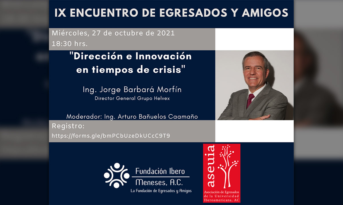 La Universidad Iberoamericana y la Asociación de Egresados de la Universidad Iberoamericana (ASEUIA), los invitan al IX Encuentro de Egresados y Amigos FIM-ASEUIA que se llevará a cabo el 27 de octubre a las 18:30 hrs. con la conferencia "Dirección e Innovación en tiempos de crisis" con el Ing. Jorge Barbará Morfin, Director General de Grupo Helvex. Modera el Ing. Arturo Bañuelos Caamaño.
