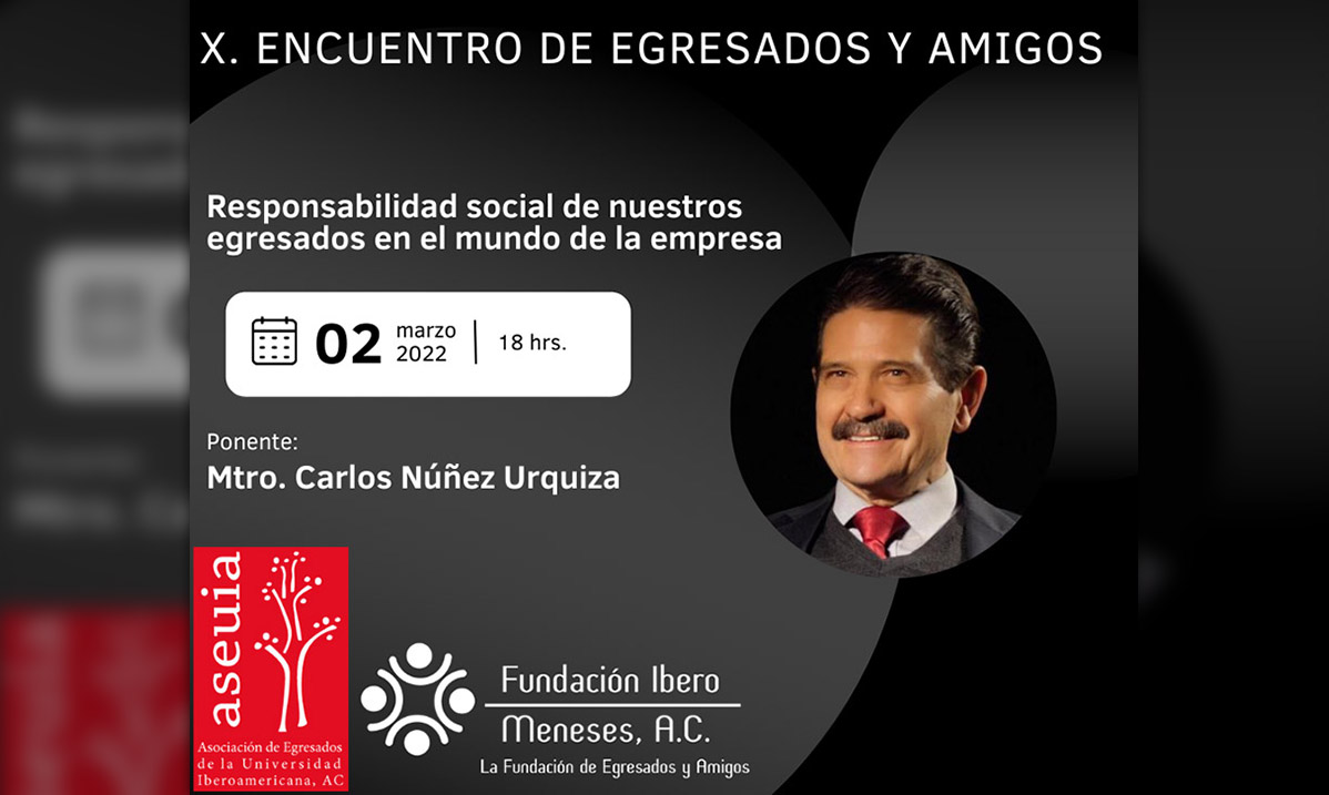 La Universidad Iberoamericana y la Asociación de Egresados de la Universidad Iberoamericana (ASEUIA), presenta el X Encuentro de Egresados y Amigos FIM-ASEUIA que se llevó a cabo el 2 de marzo de 2022 a las 18:00 hrs. con la conferencia "Responsabilidad social de nuestros empleados en el mundo de la empresa", impartida por el Mtro. Carlos Núñez Urquiza.