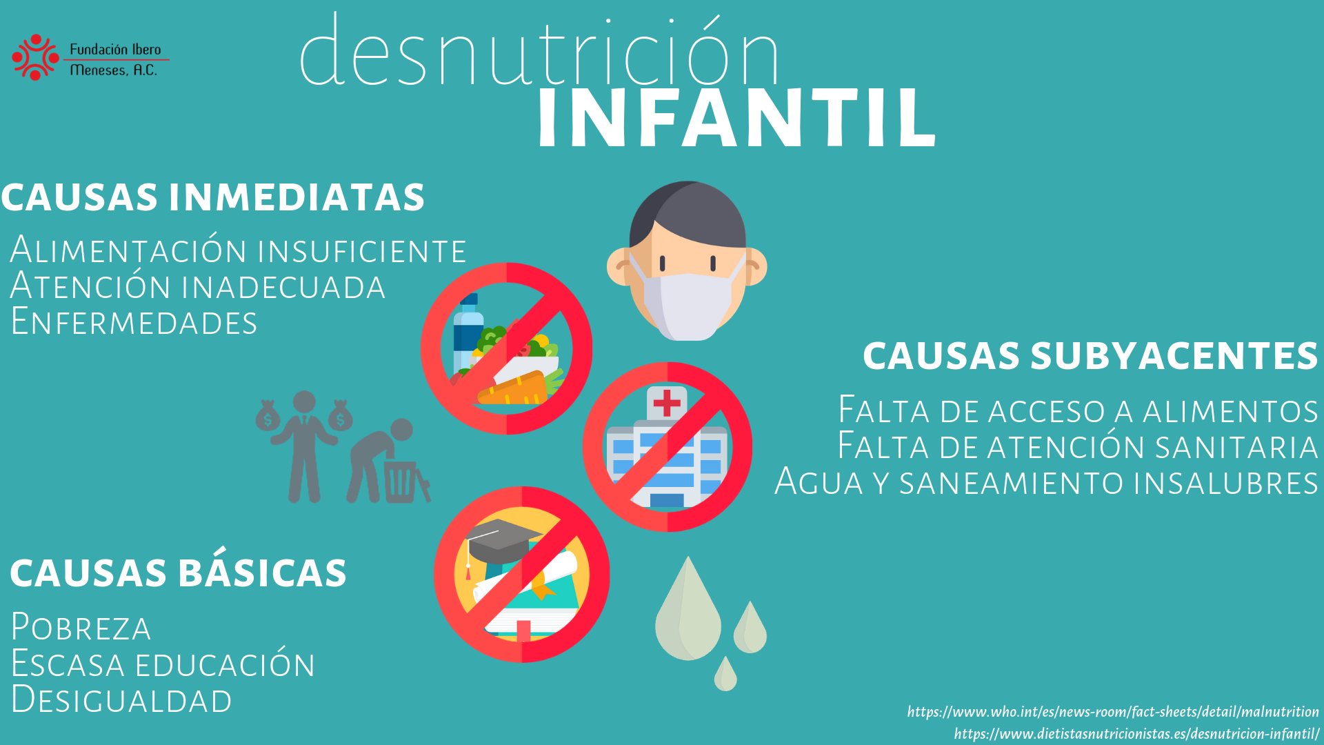 La desnutrición infantil es el resulado de la ingesta insuficiente de alimentos, la aparición de enfermedades infecciosas y la falta de una buena atención. El origen de estas causas son los factores sociales, económicos y políticos como la pobreza, la desigualdad y la falta de educación.